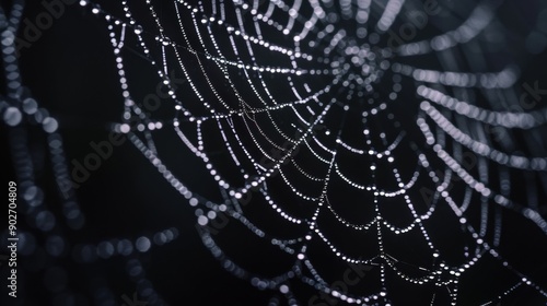 Dew-Kissed Web: A delicate spiderweb shimmers with morning dew, its intricate design highlighted against a dark background. The image evokes a sense of mystery, tranquility, and the beauty of nature's