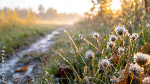 Dewy autumn field with scattered wildflowers gently softening under a blanket of morning fog, as a dirt path winds into the misty distance