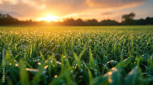 Dewy Grass Field at Sunset