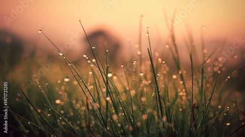 Dewy Grass in the Early Morning Light with Soft Bokeh Background