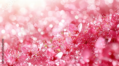 Dewy pink blossoms in spring sunlight, bokeh background.