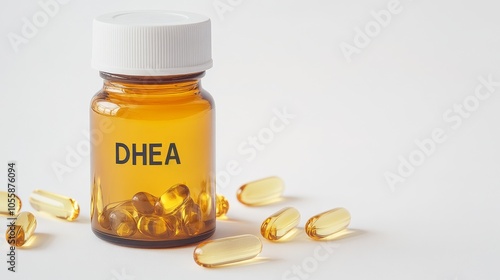 DHEA amber glass bottle with scattered yellow softgel capsules on a clean white background, symbolizing health, hormone support, and energy enhancement