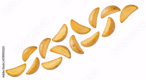 Diagonal Pattern of Floating Potato Wedges Isolated White Background