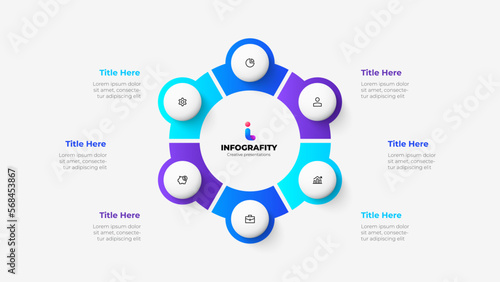 Diagram divided into 6 parts with circles. Design concept of six steps or parts of business cycle. Infographic design template