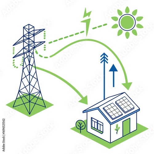 Diagram illustrating the flow of solar energy from the sun to a house with solar panels and connection to the power grid