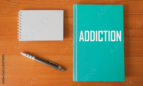 Diary with the inscription Addiction on the table with a pen and notepad for writing