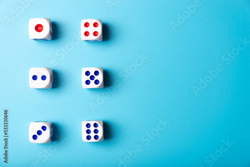 Dice with numbers on a blue background. Dice minimalism