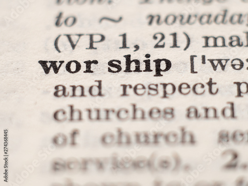Dictionary definition of word worship, selective focus.