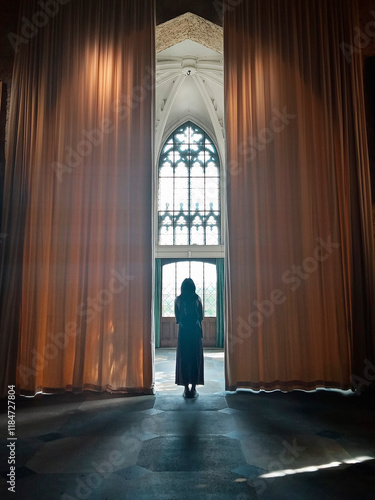 Die Silhouette einer Frau im großen Raum mit Vorhängen