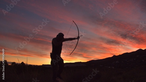 Die Silhouette eines Bogenschützen bei Sonnenuntergang