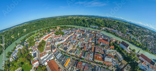 Die Stadt Wasserburg am Inn im oberbayerischen Alpenvorland aus der Vogelperspektive