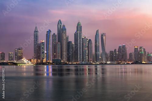 Die Wolkenkratzer der Dubai Marina während eines dramatischen Sonnenunterganges