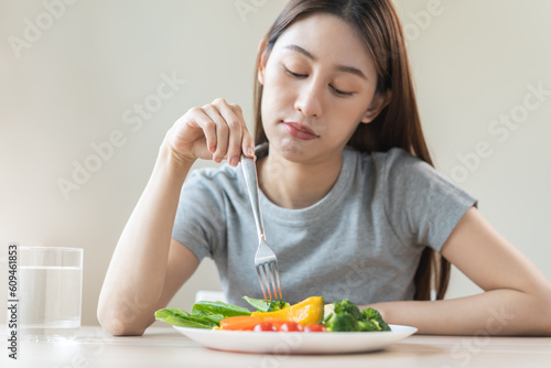 Diet in bored face, unhappy beautiful asian young woman, girl on dieting, holding fork in salad plate, dislike or tired with eat fresh vegetables. Nutrition of clean, healthy food good taste.