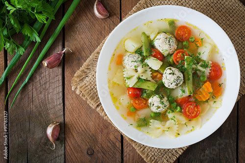 Diet vegetable soup with chicken meatballs and fresh herbs in bowl. Top view