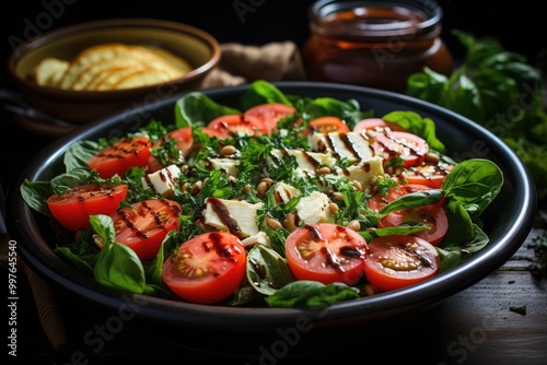 Dietary salad with tomatoes, feta cheese, lettuce, spinach and pine nuts. View o, generative IA