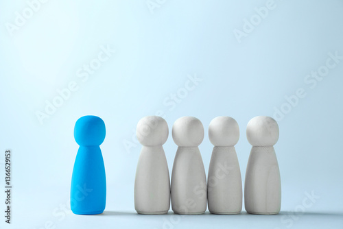 Difference, uniqueness, individuality. Blue human figure among wooden ones on light background