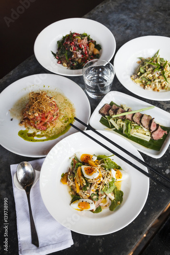 Different asian dishes at a restaurant, Candolim, Goa, India.