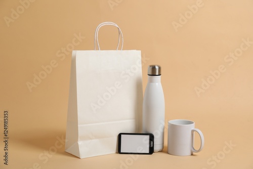 Different blank items for branding on beige background. Mockup for design