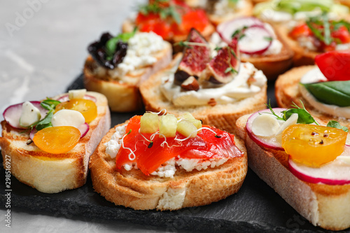 Different bruschettas on light grey marble table, closeup