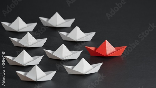 Different business concept.new ideas. paper art style.Leadership concept with red paper ship leading among white boats.3D rendering on black background.