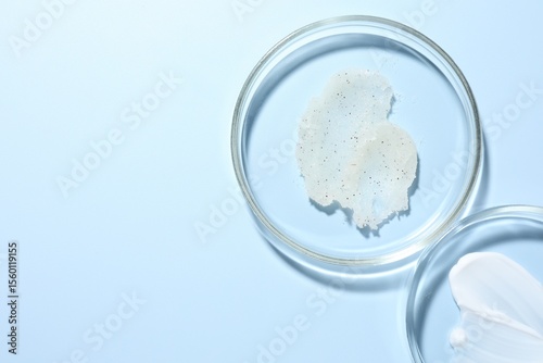 Different cosmetic products in Petri dishes on light blue background, flat lay. Space for text