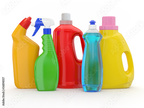 Different detergent bottles on white background