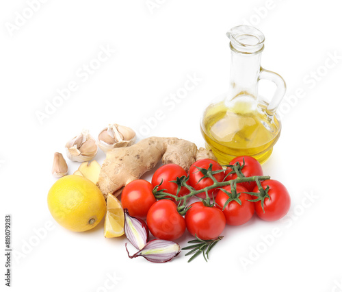 Different fresh ingredients for marinade on white background