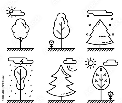 Different kinds of trees in line art style. The weather and times of year. Vector illustration of plants and nature. Ecosystem icon set.