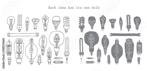 Different light bulb icon collection in doodle style. Isolated. Vector.