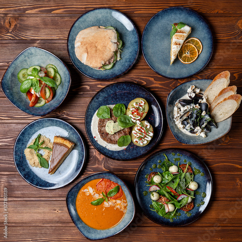 Different meals of european cuisine, placed in a circle, on a dark wooden table, top view