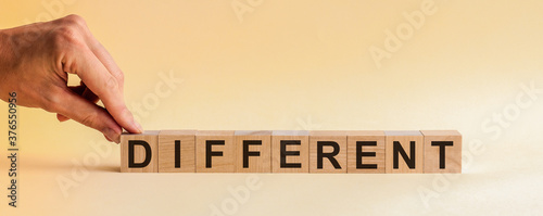 DIFFERENT message word on a wooden desk on cube blocks. The hand puts a wooden cube with the letter D from the word DIFFERENT.