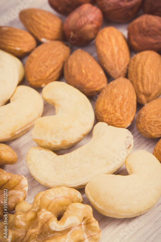 Different nuts and almonds as source vitamins and minerals. Vintage photo