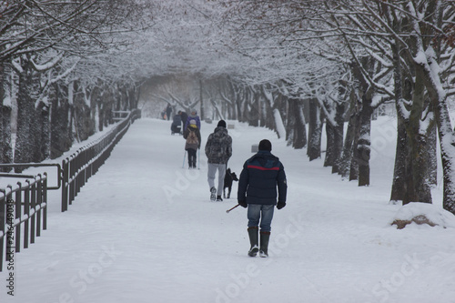 different people and dogs are on a snow-covered wide road. winter sports walk of the day. rest for the whole family on a winter day along the forest and river. frozen trees above the path