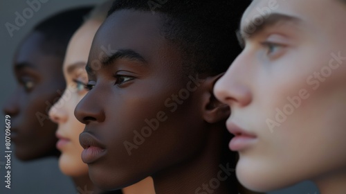 Different races multi races side faces heads African and Caucasian man and woman close up dark background