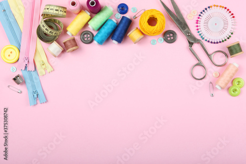 different sewing accessories on the table. Threads, needles, pins, fabric and sewing scissors close up