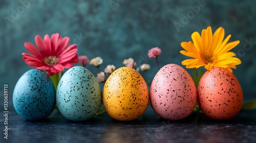 Different speckled Easter eggs with colorful flowers on dark background. Festive spring composition of new beginnings and seasonal renewal. March Equinox and spring celebrations