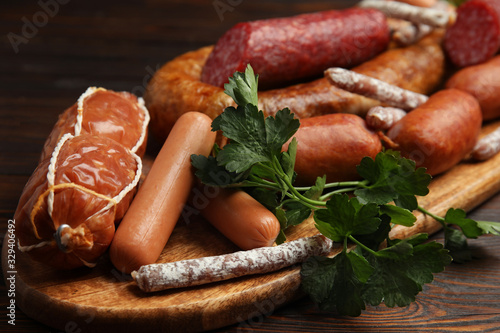 Different tasty sausages on wooden table, closeup
