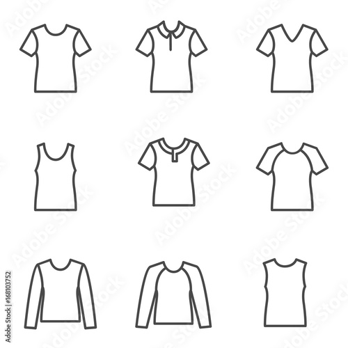 Different types of man’s t-shirts as line icons / Set of vector line icons