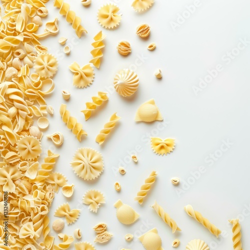 Different types of pasta creating a decorative border on a white background, offering a visually appealing culinary scene