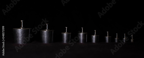 Different weights are arranged in descending order in a dark copy space background. Product photography.