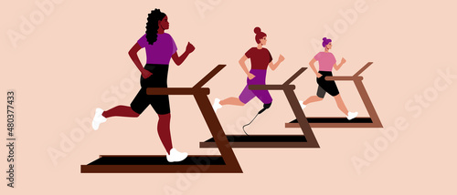 Different women jogging on treadmill, Flat vector stock illustration with women runners isolated as inclusiveness