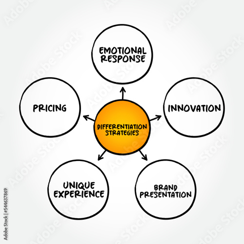Differentiation Strategy is an approach businesses develop by providing customers with something unique, different and distinct from items in the marketplace, mind map concept background