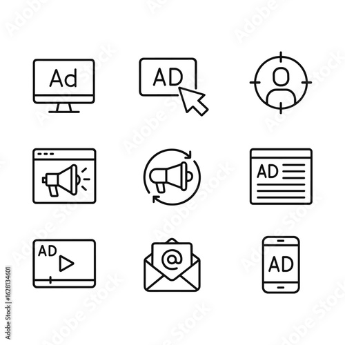 Digital advertisement vector set. Outline symbols. Line design