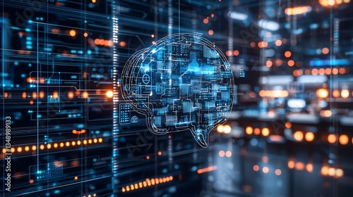 Digital AI powered mind map floating in a high tech workspace symbolizing AI creativity