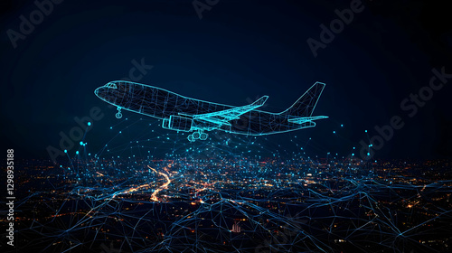 Digital Airplane Flying Over Illuminated City At Night Displaying Network Connections