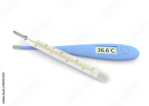 Digital and mercury thermometers show a temperature of 36.6 Celsius. 3D illustration
