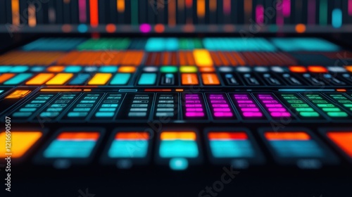 Digital art creativity and interactive, A vibrant electronic interface featuring colorful buttons and controls, ideal for music production or digital art creation.