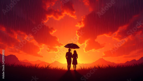 Digital art depicting a silhouette of a couple sharing an umbrella against a vibrant sunset after rain, energetic and warm mood