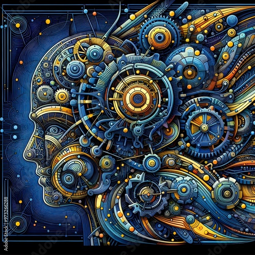 Digital art piece depicting a stylized face with intricate patterns and mechanical elements resembling a futuristic circuit board