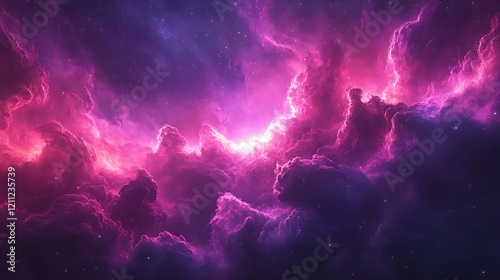 Digital artwork depicting a vibrant cosmic scene features swirling clouds of nebulae in shades of pink and purple blend seamlessly, with bright highlights and deep shadows adding depth and contrast